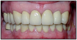 Once the wax up is approved, we prepare the patient’s teeth, takes a new impression, and fit him or her with temporaries (a temporary version of the “new smile”.) Three to four weeks later when the porcelain restorations are ready, the temporaries are removed and the porcelain is bonded to the teeth.